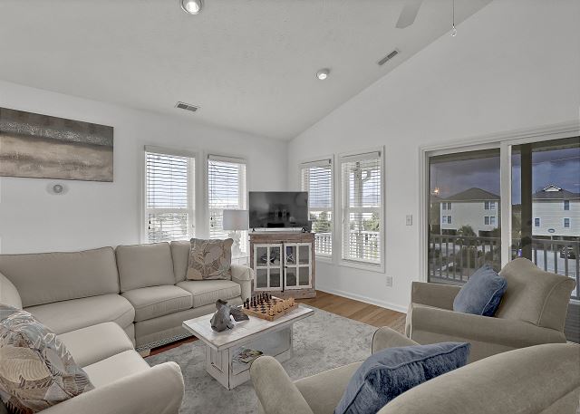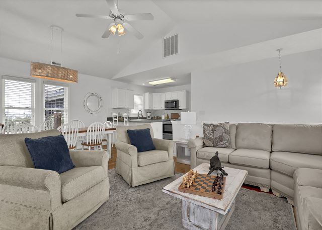 Unwind in the cozy living room, complete with a sectional sofa, swivel rockers, and a smart TV, the perfect setup for movie nights or lazy afternoons after a day on the beach.