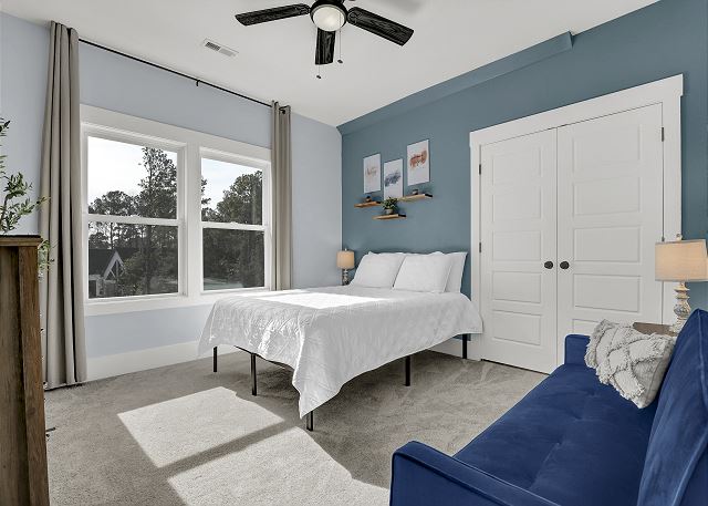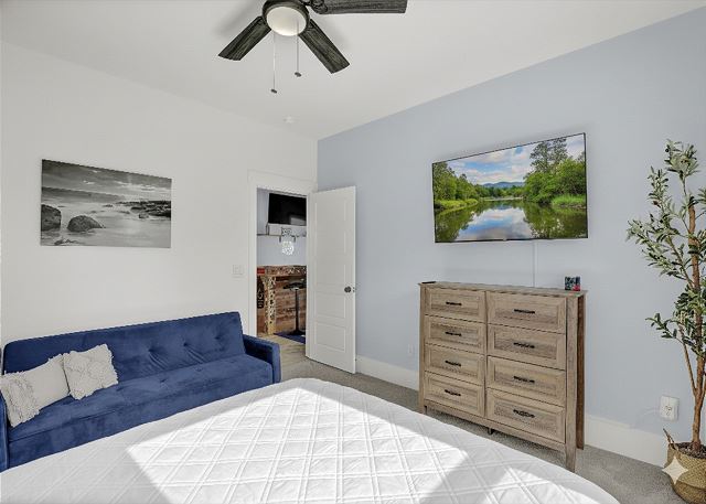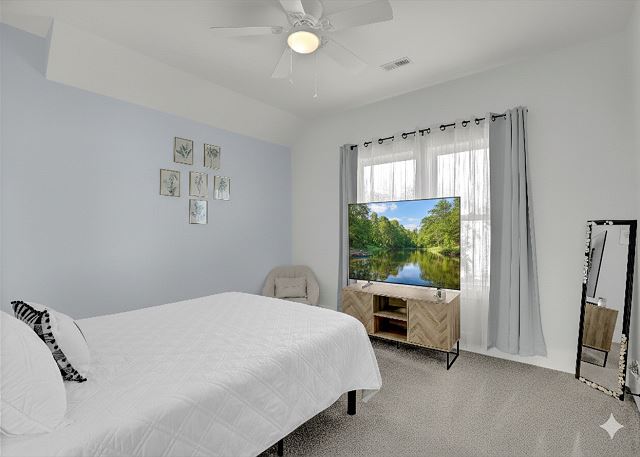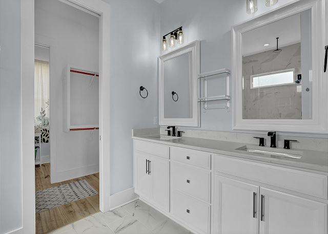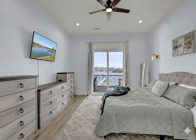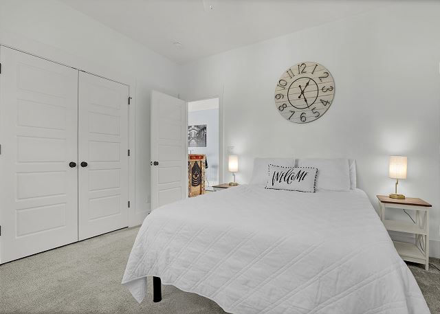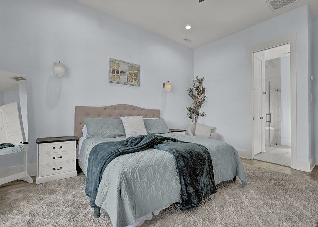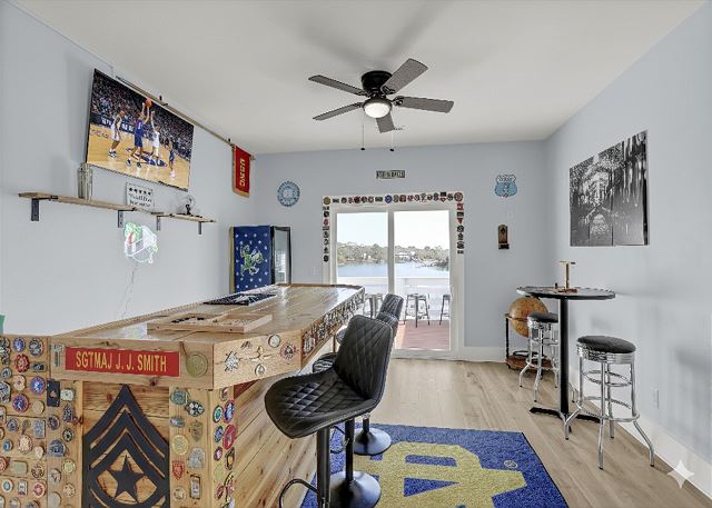 The main-level Master Bedroom offers a King size bed and a TV, along with direct sliding door access to the screened-in patio. The luxurious on-suite spa includes a soaking tub and a Moen smart shower. This remote-controlled shower is able to set your desired temperature and offers rain, handheld, regular, and tub spout functions. The suite is completed with a double vanity , remote-controlled lights , and a walk-in closet. Upstairs, Bedrooms 2 and 3 both feature Queen size beds and TVs , sharing a large 2nd-floor bathroom with a double vanity and a shower/tub combo. The 2nd level also boasts a unique, beautiful handcrafted bar area with a sliding door that opens to the outdoor top deck.
