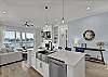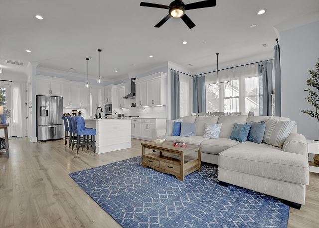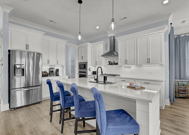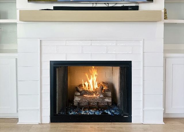 The main living area is designed for comfort, featuring a comfortable sofa with a chaise lounge , a gas fireplace , a large 62-inch TV, and a collection of books and games. A sliding door opens across the entire living room, leading out to the spacious screened-in patio. The kitchen is a gourmet's delight, equipped with all stainless steel appliances, quartz countertops, a farmhouse sink, and an island with chairs. Meals can be enjoyed at the 6-seat farmhouse dining table , and the kitchen also includes a walk-in pantry and a Ninja coffee/espresso maker.