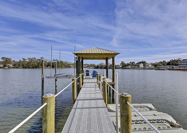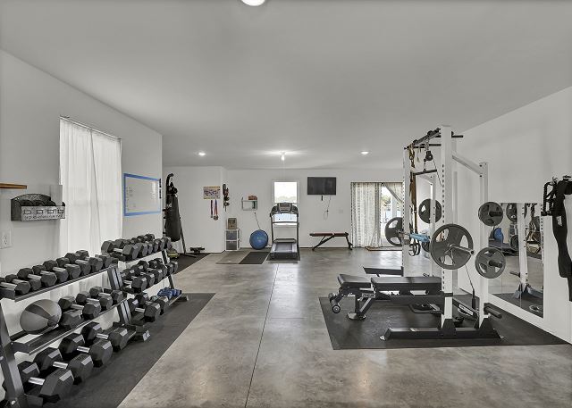 Step outside to enjoy the expansive exterior, which includes the largest backyard on the water on the street. The updated new dock provides a sitting area, fishing rod holders, a boat lift, and 2 jet ski floats. The ground level deck features a relaxing jacuzzi and an easy to access outdoor shower, and the main level screened-in patio has furniture and a Blackstone grill. Even your dogs can relax outside on their own outdoor daybed! For the active guests, one side of the garage is a full gym, complete with a complete weight bench, dumbbells (5lbs - 80lbs), a heavy bag, a treadmill, and mirrors. This location is excellent for water activities such as boating, kayaking, paddle boarding, jet skiing, tubing, and fishing , and is conveniently located right next to the boat launch.