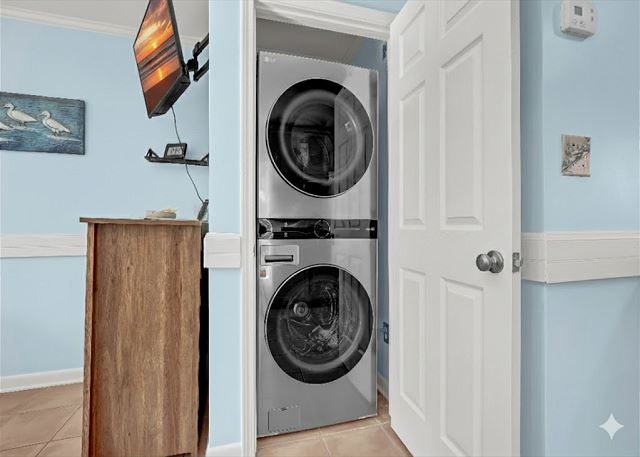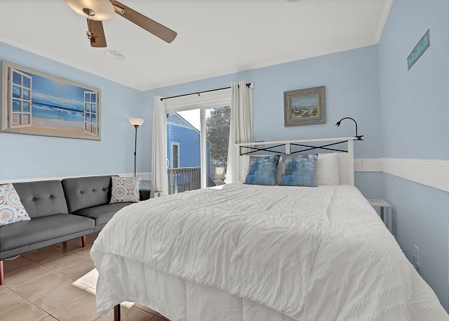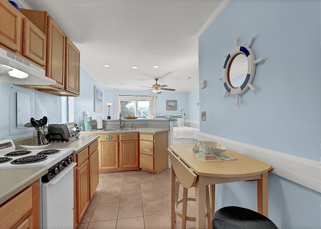 The open living space features a comfortable queen bed and futon, ideal for lounging after a day in the sun. The kitchen is fully equipped for home-style meals, offering a drop-leaf dining table with seating, kitchen island bar stools, and small appliances including a microwave, toaster oven, blender, and both a standard coffee maker and Keurig. A stacked washer and dryer add extra convenience for longer stays.