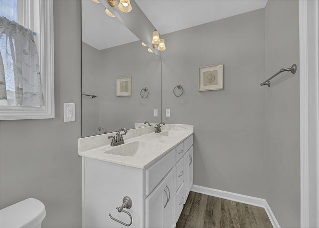 The entire top floor is dedicated to the luxurious primary master suite, featuring a king bed, cozy sitting chairs, reading lamps, bedside cabinets with technology outlets, and a large-screen TV. An adjacent quiet sitting room with full-size futon offers extra space to unwind. The spa-like ensuite bath includes a double walk-in shower, soaking tub, double vanity, and private toilet room. Enjoy private balcony decks on both ends of the suite, with one covered and the other offering stunning sunset views.